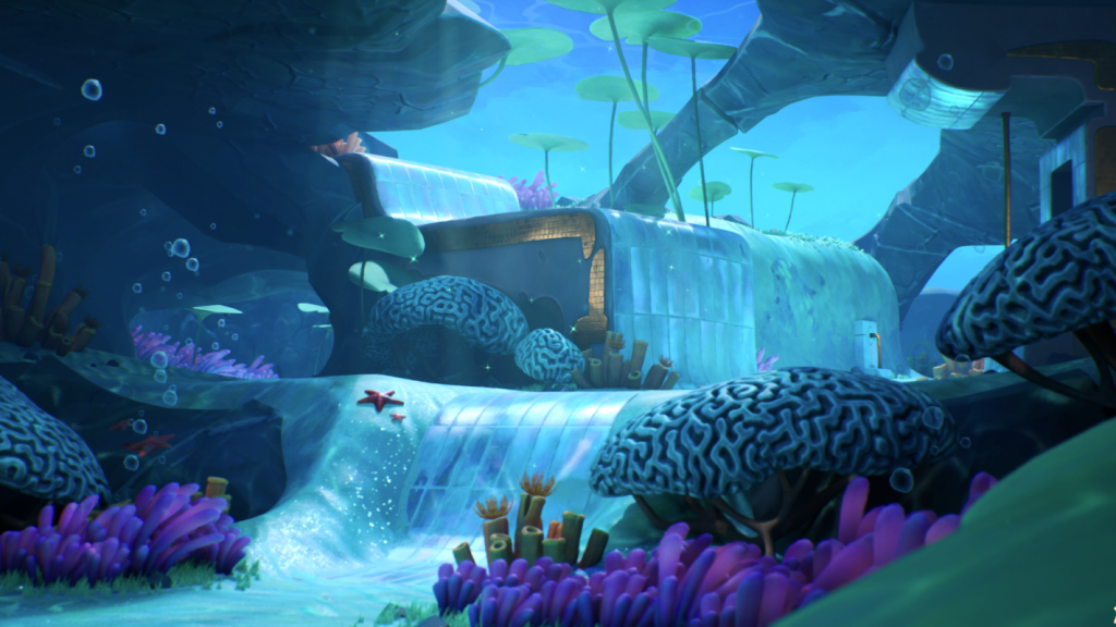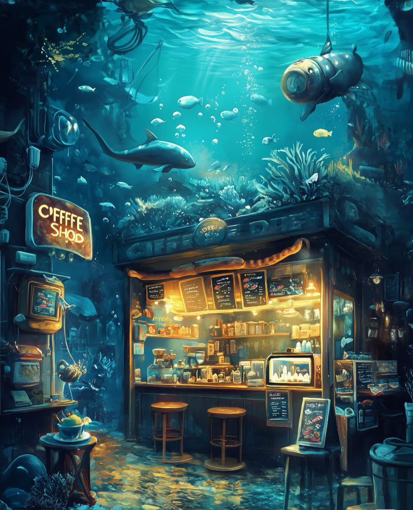 Atmosphere: A cool blue underwater environment combined with the warm yellow lighting inside the café creates a strong contrast between warm and cold tones