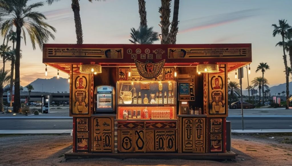 - Furniture & décor: Bar stools, tables and chairs, small chalkboard menus, neon signs, and awning designs